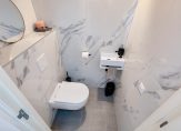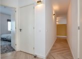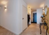 The apartment is situated on the second floor. The entrance opens into a spacious hallway featuring a built-in cupboard with fibre-optic internet connection, a modern, fully equipped distribution board, and an alarm system. A beautifully wide corridor in warm ochre tones offers a refined welcome for guests, with a cloakroom recess featuring a hat shelf and a stylish guest WC with a designer washbasin.