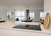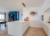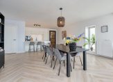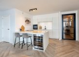 De moderne open keuken in lichte tonen is van alle gemakken voorzien, heeft veel bergruimte een gezellige bar, vaatwasser, koel/vriescombinatie, warm water kraan, inductiekookplaat met ingebouwde afzuiging, composieten aanrechtblad, combioven en wijnklimaatkast. Een pronkstuk in de eetkamer.