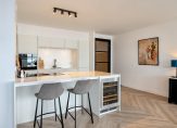 The contemporary open-plan kitchen, finished in light tones, is fully equipped with ample storage, a charming breakfast bar, a dishwasher, a fridge-freezer combination, a boiling water tap, an induction hob with integrated extraction, a composite worktop, a combination oven, and a climate-controlled wine cabinet—an exquisite centrepiece within the dining area. A deep built-in cupboard provides practical storage for household essentials, while there is ample space for a grand dining table. The elegant herringbone-patterned PVC flooring enhances the refined ambiance.