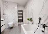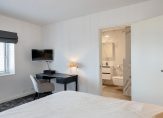 De master bedroom ligt aan de andere kant van de gang en heeft uitzicht op zee en het beeld van Neptunus, een luxe en suite badkamer met heerlijk ligbad, 2e wc, inloopdouche, ruim wastafelmeubel met dubbele wastafel en een handdoekradiator.