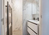 From the hallway, the private quarters lead to all bedrooms. A convenient laundry room accommodates the washing machine, tumble dryer, drying rack, and ironing board. The first bathroom is intelligently arranged, featuring a luxurious vanity unit, a walk-in shower, a heated towel rail, and refined tiling.