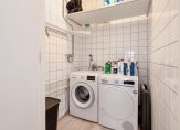Handige waskamer met de opstelplaats voor de droger, wasmachine, droogrek en strijkplank. De 1e badkamer is slim ingedeeld met en luxe badkamermeubel en inloopdouche, handdoekradiator en mooi tegelwerk.