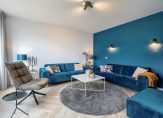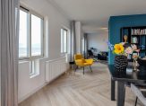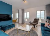 Door de slimme indeling is er een rustige loungehoek gecreëerd in stoere kleurzetting met tevens zeezicht.