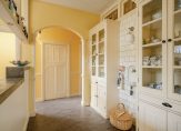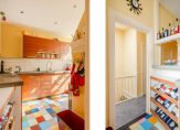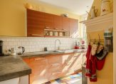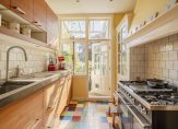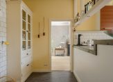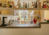 Vanuit de L-vormige overloop tevens toegang tot de sfeervolle open moderne keuken met een verhoogde aanrecht in L-opstelling met 2 Rvs spoelbakken, koelkast, vriezer, vaatwasser, originele schouw met 4 pits “Boretti” fornuis met bakplaat. en dubbele oven, originele servieskast. Tevens 2 ingebouwde servieskasten. origineel fontein, “Marmoleum” vloer en deur naar het achterbalkon.