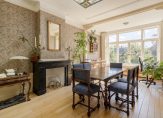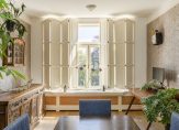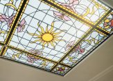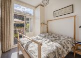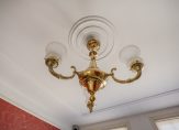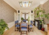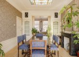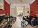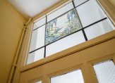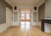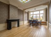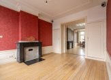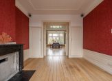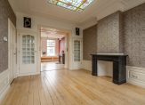 Fraaie lichte L-vormige kamers en suite middels bijgetrokken vergrootte voorzijkamer met originele schuifseparatie met paneeldeuren en 4 vaste kasten, ornamenten plafonds, 2 zwart marmeren schouwen, massieve lichte houten vloeren, radiatorkasten, raambekleding aan de achterzijde middels op maat gemaakte luiken, extra lichtinval middels een groot zelf ontworpen en geplaatst glas in lood dakraam. In het