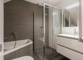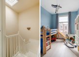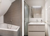 Aan de voorzijde de eerste ruime slaapkamer met grote raampartij. De luxe badkamer is vanuit de gang te bereiken en is voorzien van fraai lichtgrijs tegelwerk, inloopdouche met glazen wand, toilet, handdoekradiator, ligbad en badkamermeubel met wastafel. Vanuit de gang de trap naar de eerste etage met de tweede slaapkamer die eveneens ruim van formaat is. Voorts trap naar de tweede etage, overloop met daklicht en vaste kast voor cv-ketel. De derde slaapkamer is eveneens aan de voorzijde gelegen en is ongeveer even groot als de eerste twee slaapkamers.