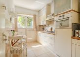 At the rear of the apartment are two bedrooms and a well-equipped kitchen, all of which offer direct access to the beautiful, southeast-facing garden. The garden features a spacious terrace and lush, mature plantings, offering peace and privacy.