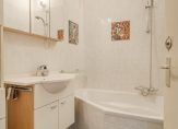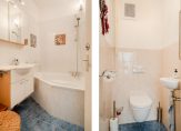 A separate toilet with a small basin and an internal bathroom—complete with bathtub, washbasin with vanity unit, and mirrored cabinet—are both located off the spacious hallway.