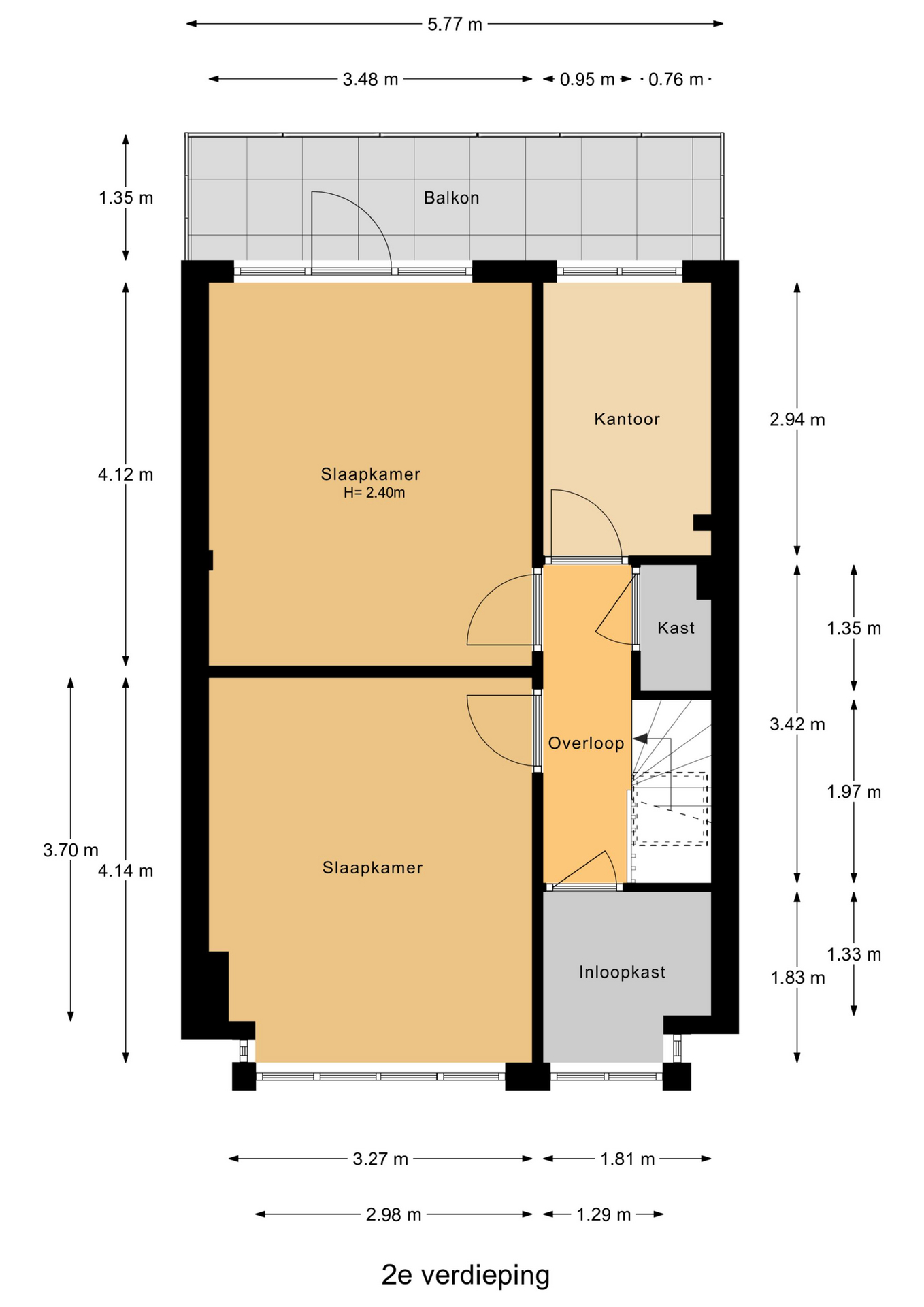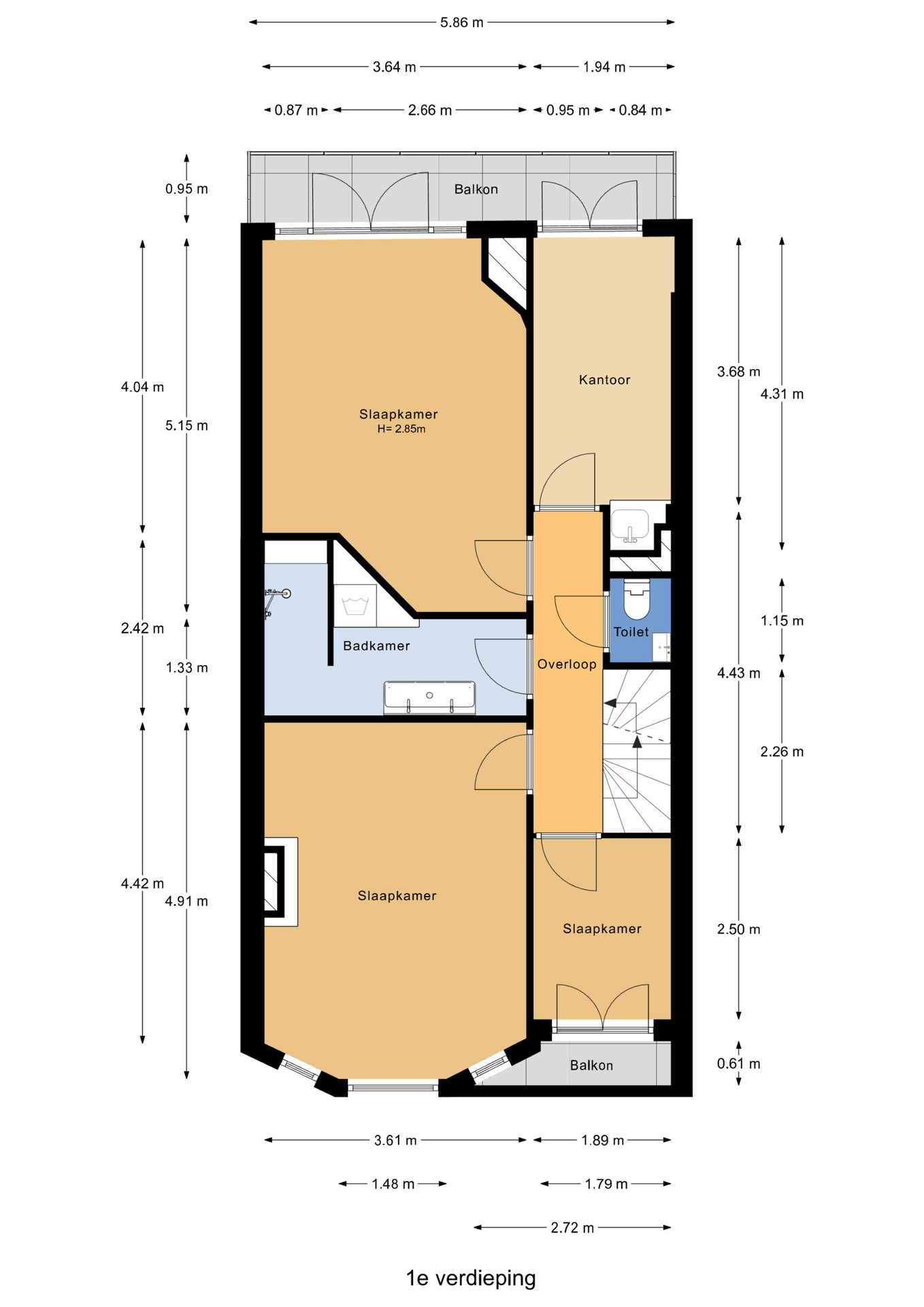 De 2e etage is voorzien van een overloop met ruime bergkast, een grote achterkamer met deur naar een ruim balkon, een achterzijkamer, een grote voorkamer en een voorzijkamer die thans in gebruik is als kastenkamer.