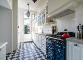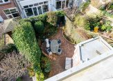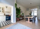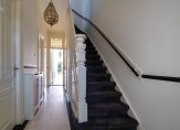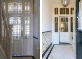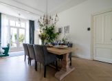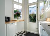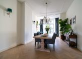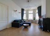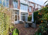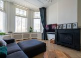 Entree met vestibule, fraaie marmeren tegels, ornamenten plafond, maatwerk garderobekast met uitgebreide elektrische installatie en schitterend origineel glas in lood dat aan beide zijden van de vestibule in zowel de tochtdeur, de bovenlichten als het kozijn is verwerkt. De hal is voorzien van plavuizen vloer met apart toilet voorzien van fraai tegelwerk, meubel met fonteintje en hangend toilet. De kelder van ca. 13 m² met stahoogte is vanuit de hal te bereiken en voorzien van stookruimte met hoogwaardige Nefit cv-combiketel. Vanuit de hal de spectaculaire kamers en suite ca. 13.67×3.87 met schitterende lichtinval, zeer hoge ornamenten plafonds van ca. 3.31m hoog, erker aan de voorzijde, visgraat parketvloer, glas in lood bovenlichten, wandverlichting, schuifseparatie, open haard en openslaande deuren naar zonnige achtertuin ca. 53 m² die pal zuidwest is gelegen. De achtertuin is zeer smaakvol aangelegd en bovendien veel dieper dan de naastgelegen herenhuizen omdat er in het verleden een aangrenzend perceel is bijgetrokken. Aan de achterzijde de luxe open keuken ca. 5.93×1.97 die is voorzien van hoog model Siemens koelkast, 5-pits Falcon gasfornuis met dubbele oven en ingebouwde grill, Siemens vaatwasser, Siemens vriezer, kokend waterkraan, granieten werkblad, dubbele spoelbak en deur naar de achtertuin.