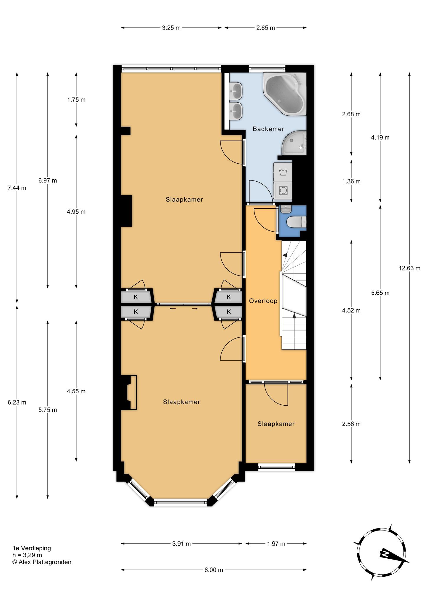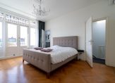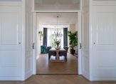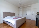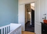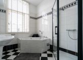 Vanuit de hal een luie trap naar de eerste etage, overloop met toilet voorzien van porseleinen spoelbak in klassieke stijl, zijkamer aan de voorzijde ca. 2.56×1.97 in gebruik als babykamer maar ook zeer geschikt als werkkamer met visgraat parketvloer en glas in lood bovenlichten, riante slaapkamer aan de voorzijde ca. 6.23×3.91 met hoog ornamenten plafond, visgraat parketvloer, natuurstenen schouw en schuifseparatie naar riante slaapkamer aan de achterzijde ca. 7.44×3.91 die eveneens is voorzien van parketvloer en ornamenten plafonds. Vanuit deze hoofdslaapkamer de en suite badkamer ca. 9 m² voorzien van jacuzzi, dubbele wastafel, douche, elektrische vloerverwarming en opstelplaats voor wasmachine en -droger.