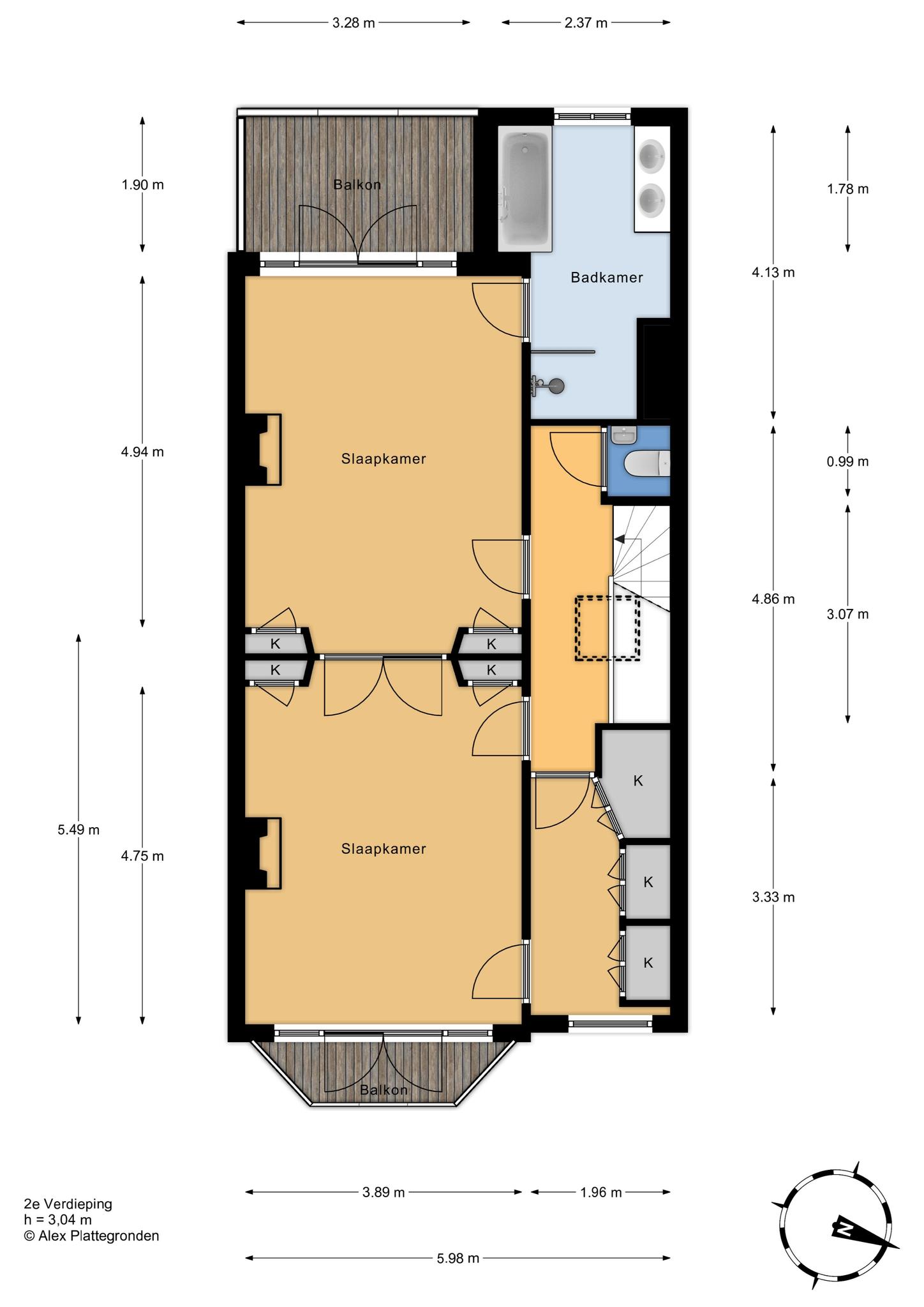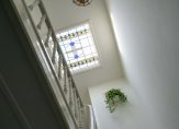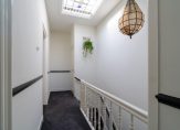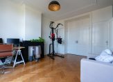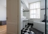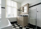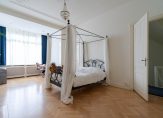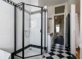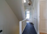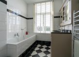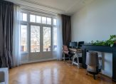 Vanuit de overloop de trap naar de tweede etage, overloop met spectaculaire lichtinval dankzij groot daklicht met glas in lood en apart toilet voorzien van porseleinen spoelbak in klassieke stijl. Zijkamer aan de voorzijde ca. 3.33×1.96 met maatwerk kastenwand, slaapkamer aan de voorzijde ca. 5.49×3.89 met openslaande deuren naar voorbalkon, slaapkamer aan de achterzijde ca. 4.94×3.89 met airconditioning en openslaande deuren naar achterterras. De tweede badkamer ca. 9 m² is eveneens aan de achterzijde gelegen en voorzien van ligbad, meubel met dubbele wastafel, handdoekenradiator en inloopdouche.