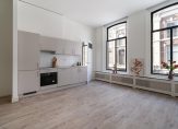 Entree van het voormalig herenhuis, trap naar de 1e etage, entree appartement, sfeervolle woonkamer met grote raampartijen, hoge plafonds en luxe open keuken in voorzien van inductiekookplaat, oven, koel-/vriescombinatie, afzuigkap en vaatwasser. Aan de voorzijde de ruime slaapkamer die eveneens is voorzien van grote raampartij, een aparte wasruimte en moderne badkamer voorzien van grote witte wandtegels, zwarte plavuizen, toilet, douche en wastafel.