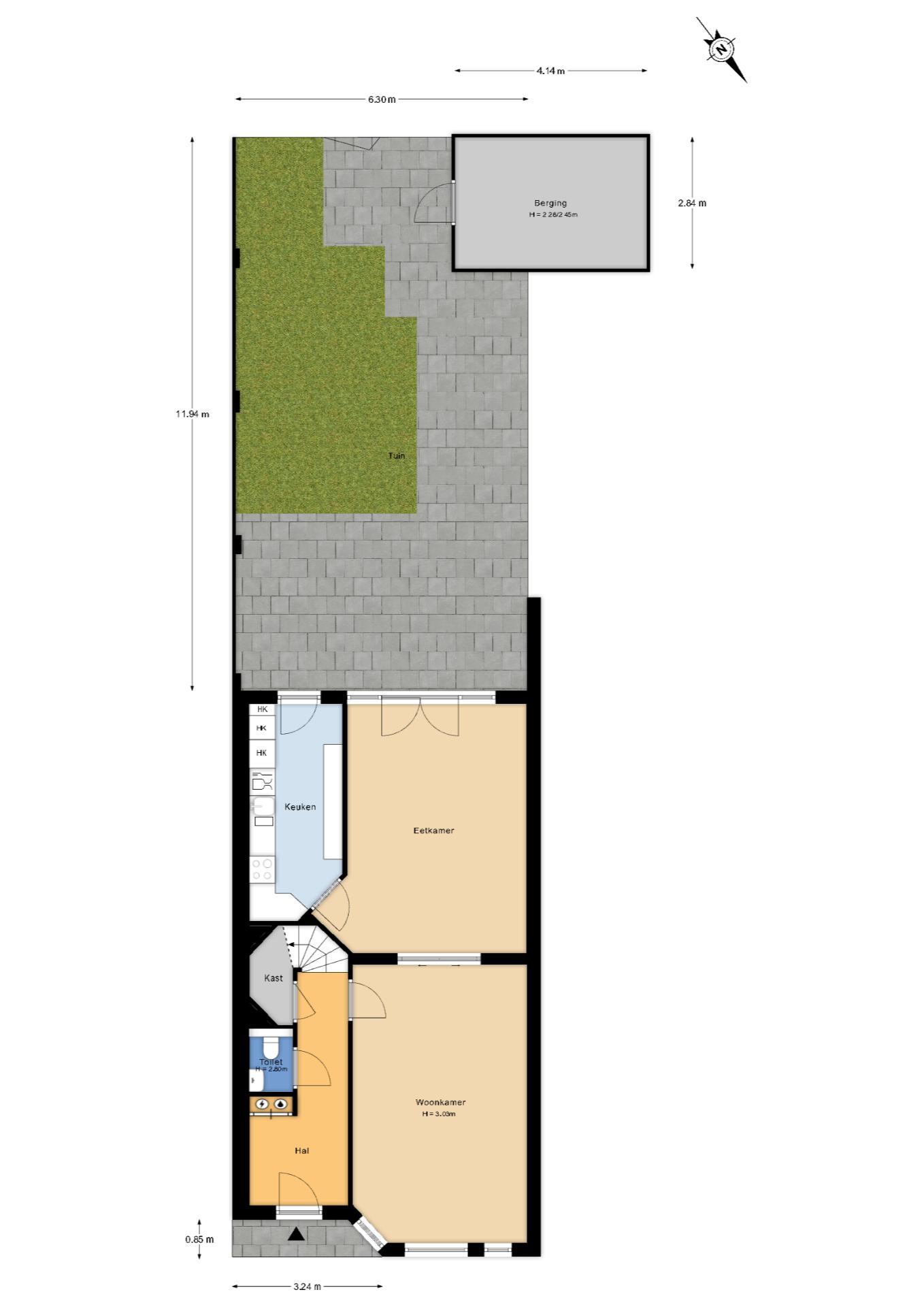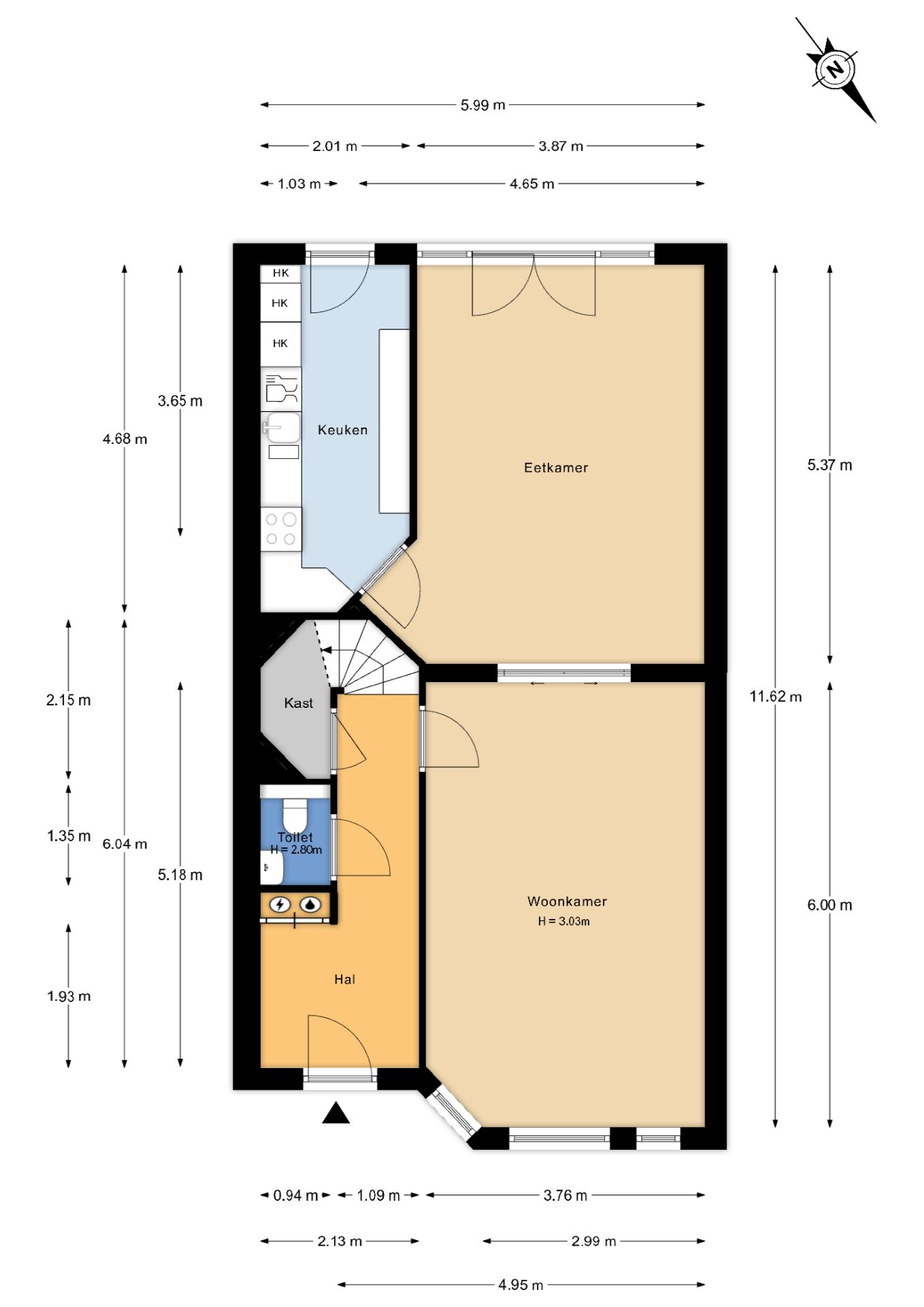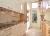 Riante hal met meterkast, toilet met fonteintje en garderobekast onder de trap. Vanuit de hal de woon-/eetkamer en suite met meer dan 3 meter hoog plafond, grote raampartijen aan de achterzijde met spectaculaire lichtinval en openslaande deuren naar uitzonderlijk diepe achtertuin van totaal ca. 75 m², perfect gelegen op het zuidwesten en voorzien van achterom en stenen schuur. De keuken is eveneens aan de achterzijde gelegen en voorzien van hardstenen werkblad, inbouwoven, inbouwmagnetron, koel-/vriescombinatie, inductiekookplaat en Miele vaatwasser.
