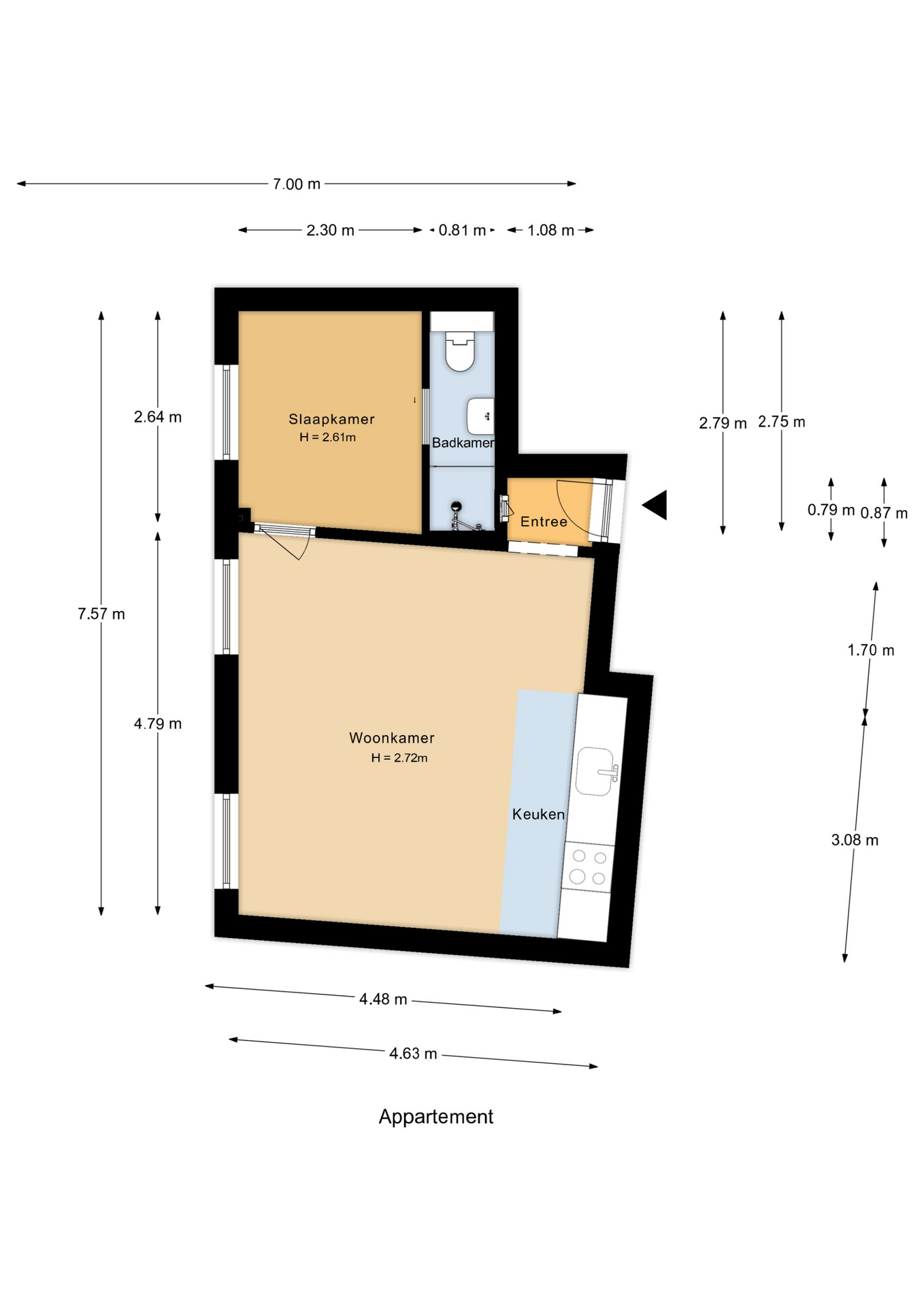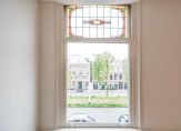 Entree van het complex op straatniveau, trap naar de 1e etage, entree appartement, woonkamer met hoog plafond en gunstige lichtval, karakteristieke glas in lood bovenlichten en open keuken voorzien van inductie kookplaat, rvs gootsteen en afzuigkap. De slaapkamer is aan de voorzijde gelegen en beschikt eveneens over hoog plafond en glas in lood bovenlicht. De moderne badkamer is voorzien van fraai tegelwerk, wandcloset, wastafel en douche.