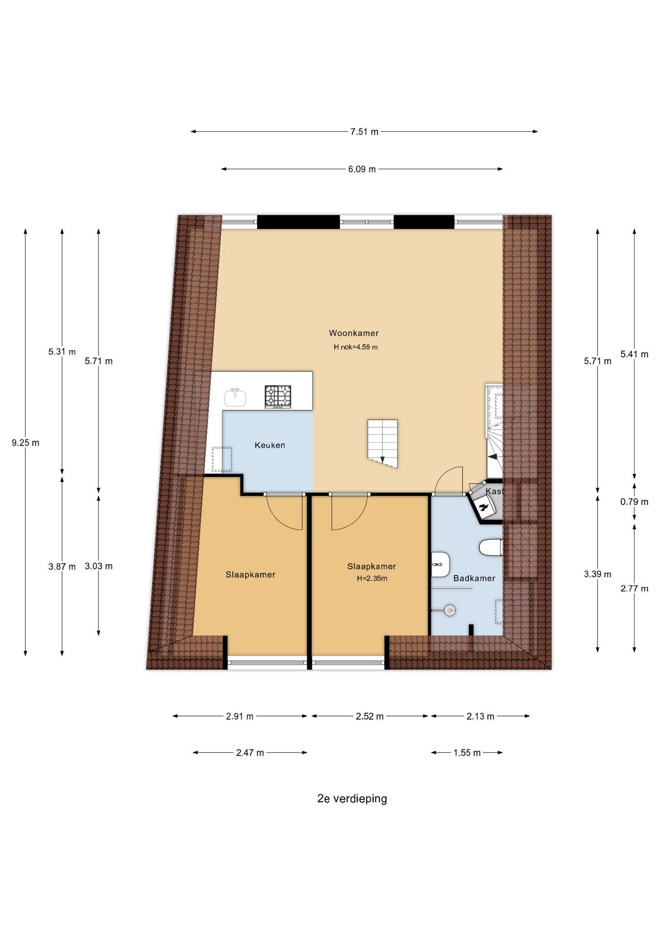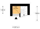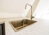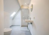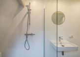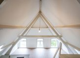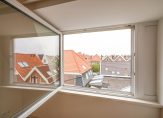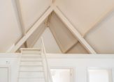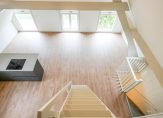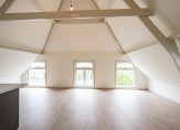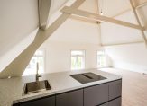Entree van het complex op straatniveau, trap naar de 1e etage, entree appartement, trap naar de 2e etage, woonkamer met 4,59 hoge nok, gunstige lichtval, balken in het zicht, verrijdbare trap naar vliering en open keuken in hoekopstelling voorzien van inductie kookplaat met geïntegreerde afzuiging, rvs gootsteen en vaatwasser. De twee slaapkamers zijn rustig gelegen aan de achterzijde en ruim van formaat. De stijlvolle badkamer beschikt over fraai tegelwerk, daklicht, inloopdouche met glazen wand, wandcloset en wastafel.