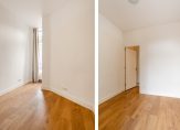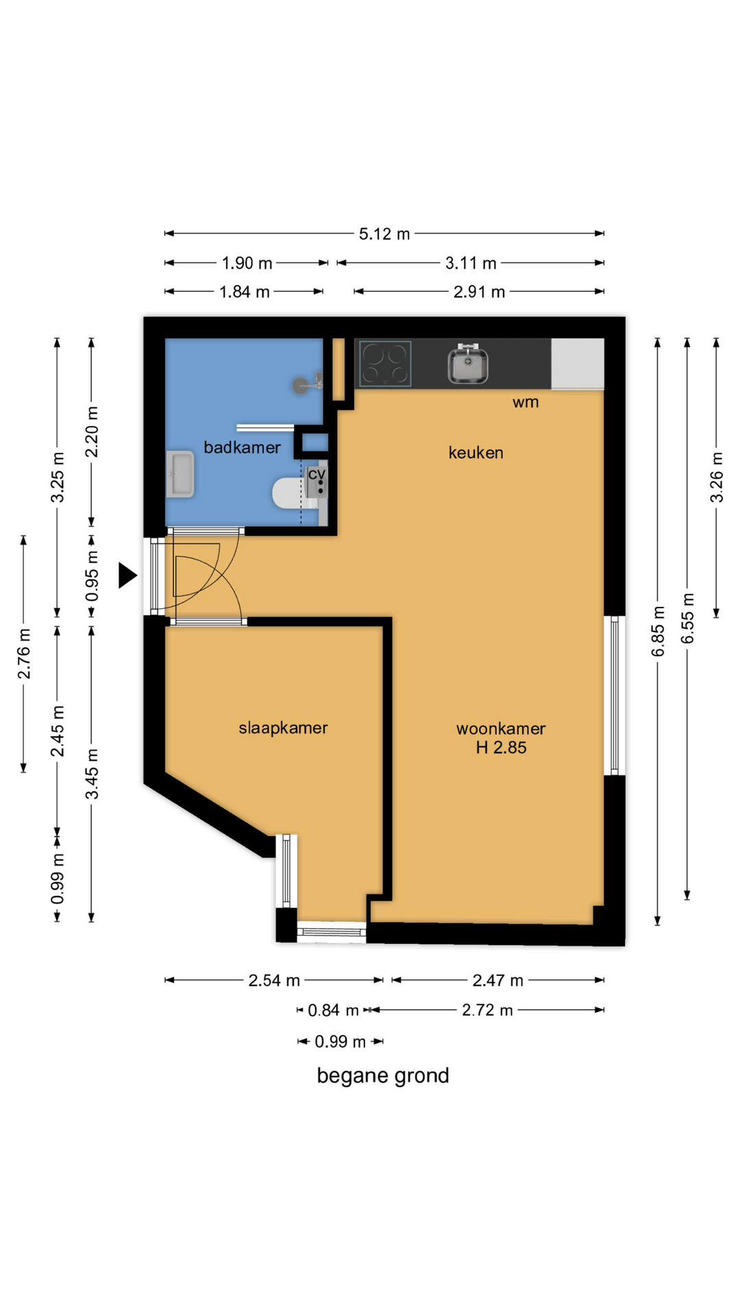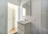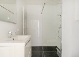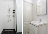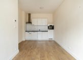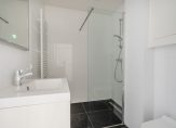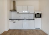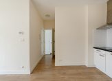 Gedeelde entree op straatniveau, entree apaprtement, hal met deur naar de slaapkamer voorzien van keurige laminaatvloer, moderne badkamer aan de andere zijde voorzien van fraai tegelwerk, inloopdouche met glazen wand, meubel met wastafel, vaste kast met cv-ketel, handdoekradiator en wandcloset. De woonkamer is voorzien grote raampartij, nette laminaatvloer en moderne open keuken voorzien van combimagnetron, vaatwasser, rvs spoelbak en inductiekookplaat.