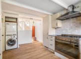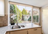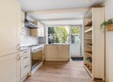 Karakteristiek entree van het hofje, entree van de woning met vestibule, woon-/eetkamer met ca. 2.92 hoge balken plafond en zeer gunstige lichtinval dankzij grote raampartijen. De moderne keuken in hoekopstelling is aan de achterzijde gesitueerd en voorzien van 5-pits “Smeg” gasfornuis met brede oven, koel-/vriescombinatie, afzuigkap en vaatwasser. De eerste slaapkamer is aan de achterzijde gelegen en ook zeer geschikt als werkkamer die aan de tuin grenst. Vanuit de keuken is de achtertuin te bereiken die vanwege de diepte verrassend zonnig is en is voorzien van schuur en achterom. De tussengelegen badkamer is voorzien van fraai tegelwerk, toilet, meubel met wastafel, natuurlijk licht en kwartronde douchecabine.