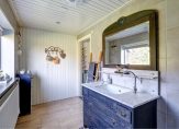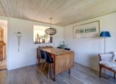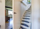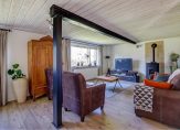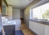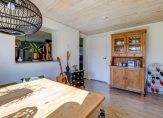 Aan de linkerzijde van de hal wacht een gezellige eetkamer op u. Hier grenst direct de woonkamer aan, voorzien van een sfeervolle pelletkachel. Vanuit de eetkamer is de kelderkast bereikbaar en via een afgesloten trapopgang komt u op de eerste verdieping. Aan het einde van de hal bevinden zich nog een toiletruimte met fonteintje en een moderne badkamer met een wastafel met meubel en een inloopdouche.