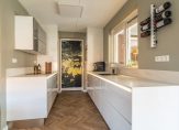 Begane grond: entree/hal, toilet, ruime L-vormige woonkamer, luxe woonkeuken met diverse inbouwapparatuur. De keuken heeft openslaande deuren naar de royale serre waar je zowel ‘s zomers als ‘s winters van je tuin kunt genieten. De begane grond is grotendeels v.v. visgraat PVC vloer waaronder een comfortabele vloerverwarming. De aangebouwde garage is geïsoleerd en op het moment in gebruik als bijkeuken en berging.