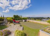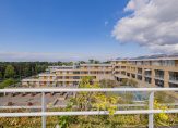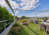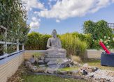 Dit penthouse heeft een dakterras dat u zelden ziet, namelijk een groene tuin op de 5e verdieping met gazon, sierplanten, bomen en een waterpartij met stenen, riet en een imposante Boeddha.