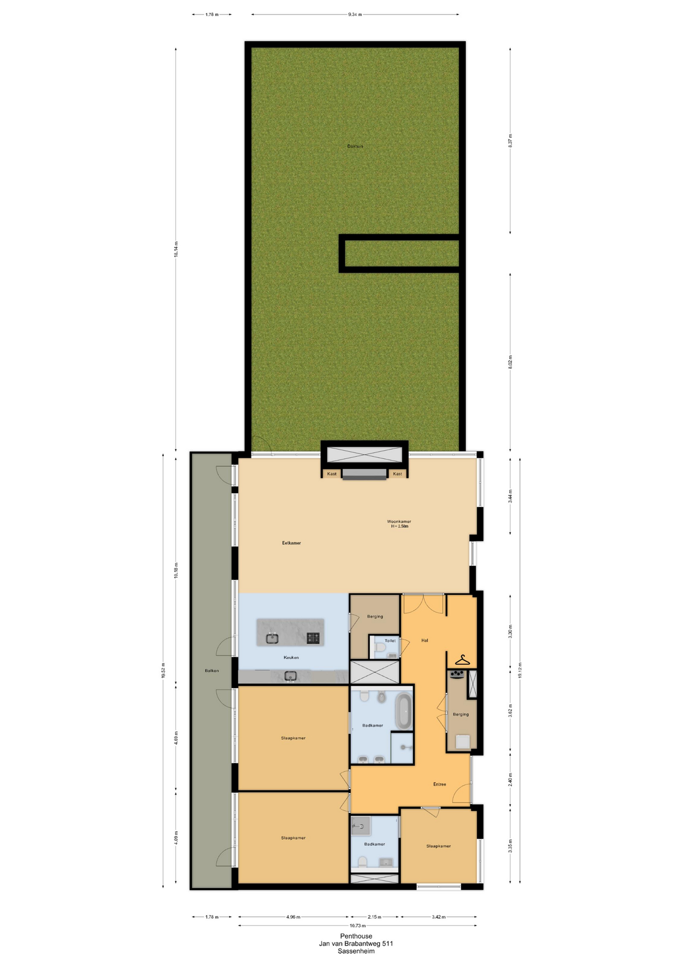 Bouwjaar 2015, woonoppervlakte 196m², daktuin 170m², dakterras 35m², 2 parkeerplaatsen van 11m², berging 6,5m², inhoud 638m³.
