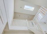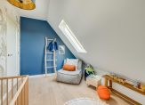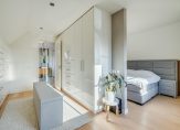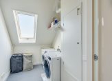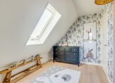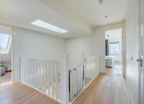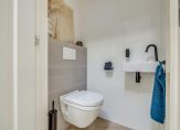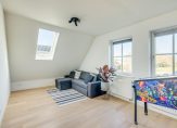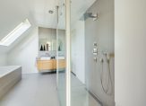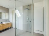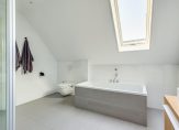 Deze luxe badkamer is voorzien van een wastafelmeubel met dubbele wastafel, een verwarmde spiegel, inloopdouche met regen- en handdouche, groot ligbad en wandtoilet. Daglicht wordt verkregen door de dakvensters. Er is voldoende ruimte om hier twee aparte badkamers van te maken. Via de tweede slaapkamer is de ruime vliering te bereiken.