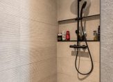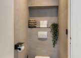 De toiletruimte is separaat en in dezelfde stijl als de badkamer geheel betegeld, voorzien van een hangend closet, speelse nis en inbouwspots.