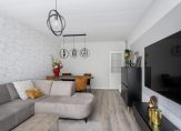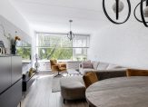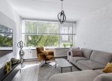 De lichte woonkamer is aan de achterzijde van het appartement gelegen en beschikt door de grote hoeveelheid raampartijen over veel natuurlijk lichtinval. Deze fijne ruimte is voorzien van een moderne vloer met hoge witte plintafwerking, strakke wandafwerking en kunststof kozijnen met dubbel glas.