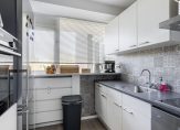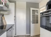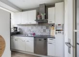 De keurige keukenopstelling is aan de galerijzijde gelegen en voorzien van een losse koel-vriescombinatie, oven, vaatwasser, inductiekookplaat met afzuigschouw en veel kastruimte. De vaste kast beschikt over de aansluiting van de wasmachine.