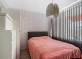 De hoofdslaapkamer is aan de achterzijde van de woning gelegen en beschikt over een oppervlakte van bijna 11 m² en is voorzien van een moderne wand- en vloerafwerking en middels een loopdeur is de toegang tot het balkon bereikbaar. Het balkon is gelegen op het zonnige zuiden en door de fijne ligging beschikt u over een weids uitzicht. Het balkon is voorzien van sfeervolle vlonderdelen en een zonnescherm.