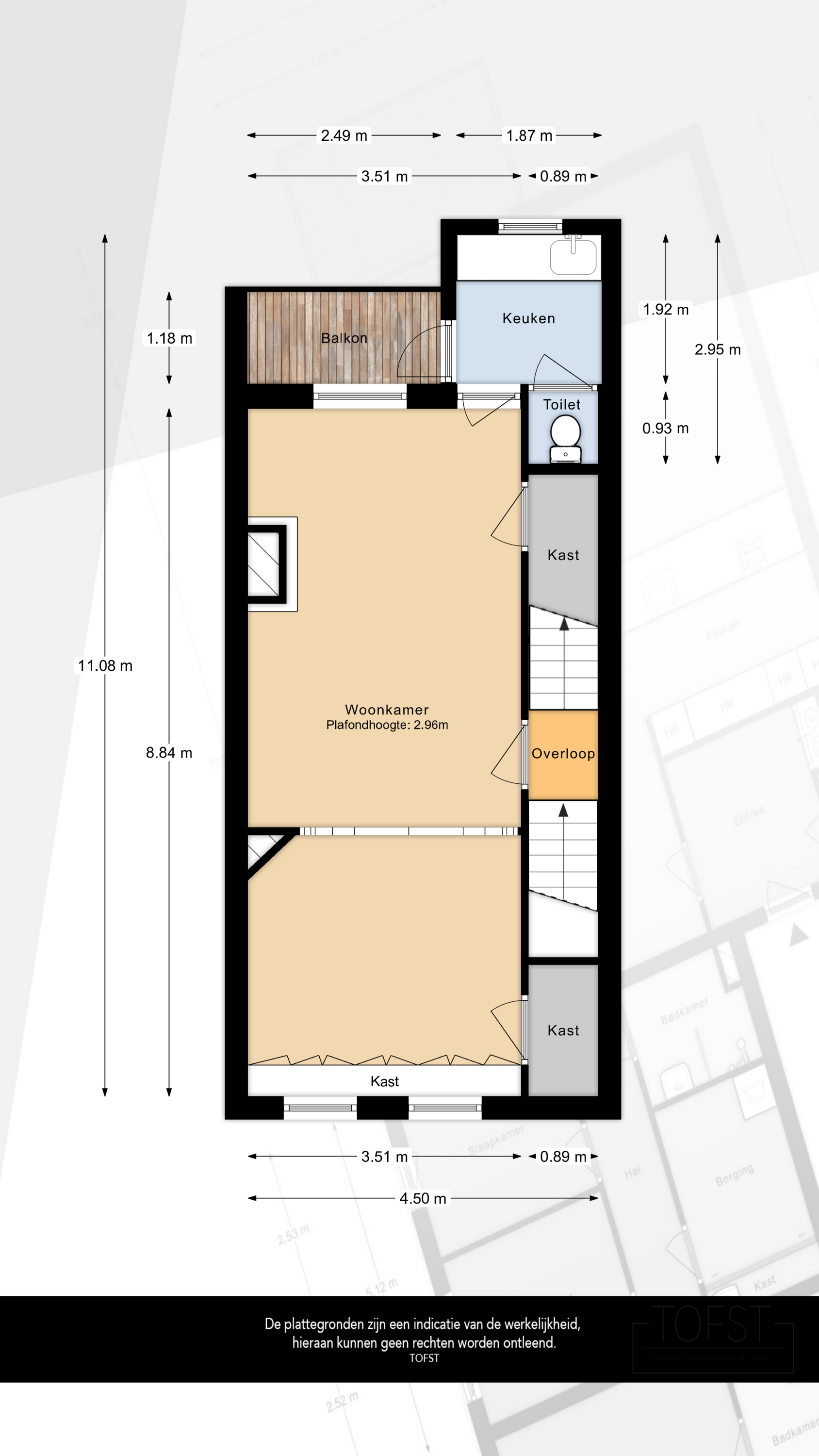 Op de begane grond is een woonkamer met gesloten keuken, eerste slaapkamer en toiletruimte aanwezig.