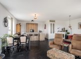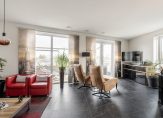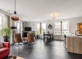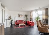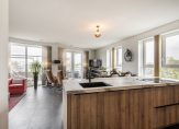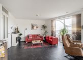 De woonkamer van circa 38 m² is heerlijk licht door de vele ramen en biedt een prettig uitzicht over de omgeving. De ruimte is afgewerkt met een fraaie pvc-vloer en voorzien van vloerverwarming/-koeling. Via de woonkamer is er middels openslaande deuren toegang tot het ruime balkon met elektrische zonwering. Het balkon is gelegen op het westen, met volop middag- en avondzon.
