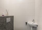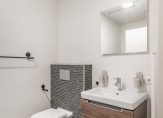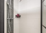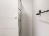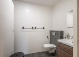 De badkamer is modern uitgevoerd met een ruime inloopdouche, tweede hangend toilet en een wastafelmeubel met spiegel. De afwerking is tijdloos in grijs-witte tinten, volledig betegeld en voorzien van mechanische ventilatie.