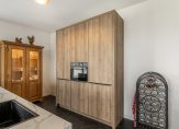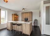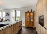 De moderne open keuken in houtlook met kook-/spoeleiland beschikt over een fraai marmerlook werkblad en alle hedendaagse inbouwapparatuur, waaronder een bora inductiekookplaat met ingebouwde afzuiging, koel-vriescombinatie, vaatwasser, combi-oven en quooker. Verder zijn er voldoende laden en kasten voor bergruimte.