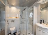 Moderne badkamer, circa 6 m², voorzien van douchecabine, wastafelmeubel met spiegel voorzien van verlichting, 2e hangend toilet, design radiator, opstelling wasmachine/ wasdroger, dakraam en betegeld tot het plafond voorzien van inbouwspots en mechanische afzuiging.