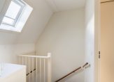 Overloop met dakraam en toegang tot 2 slaapkamers, mogelijk te verdelen in 3 slaapkamers. De gehele verdieping is keurig afgewerkt met een moderne hout look laminaatvloer en dakramen met dakluiken voor verduistering.