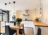 De L-vormige keukenopstelling is in 2018 compleet vernieuwd en van alle gemakken voorzien. De keuken beschikt namelijk over een inductiekookplaat met recirculatiekap, vaatwasser, combi-magnetron, oven met stoomfunctie, koelkast en veel kastruimte.