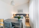 De hoofdslaapkamer met extra hoog plafond is aan de voorzijde van de woning gelegen en beschikt over een woonoppervlakte van bijna 14,5 m². Deze fijne lichte kamer is eveneens voorzien van strakke wand- en vloerafwerking, een groot zonnig balkon op het zuiden, airconditioning en houten kozijnen met dubbel glas.