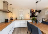 Via een trapje komt u uit in de riante woonkeuken met massief eiken vloer, die ideaal is voor een grote tafel om lekker lang te tafelen!