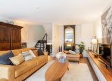 Vanuit de woonkeuken komt u met een trapje in de ruime woonkamer, die aan de voorzijde van de woning is gelegen. Door de grote raampartijen komt er veel natuurlijk licht de woning binnen. Deze heerlijke ruimte is voorzien van een strakke wand- en vloerafwerking, houten kozijnen met dubbel glas en een elektrische sfeerhaard.