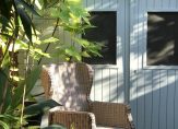 De achtertuin beschikt over een diepte van maar liefst bijna 20 meter en is voorzien van een elektrisch op afstand bedienbaar zonnescherm, vrijstaande houten berging en achterom.