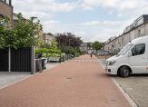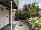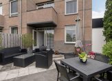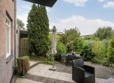 Oprit voor meerdere auto’s met toegang tot de aangebouwde garage. Ruime voortuin met fraai betegeld terras op het zonnige zuidoosten met groene borders in een autoluwe straat.