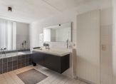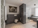 Royale badkamer circa 15 m² met ligbad, douchecabine, wastafelmeubel met spiegel, designradiator en 2e hangend toilet.