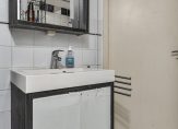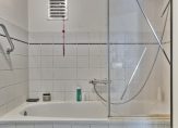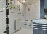 Aan de achterzijde van de woning is de deels betegelde badkamer gelegen, welke is voorzien van ligbad met douche, tweede toilet en wastafelmeubel met spiegelkast.
