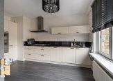 Aan de voorzijde bevindt zich de ruime woonkeuken met bijkeuken/inpandige berging. De keuken is voorzien van alle hedendaagse keukenapparatuur zoals een vijf pits gaskookplaat met afzuigschouw, oven, magnetron en vaatwasser. Via de keuken is er toegang tot de bijkeuken met veel bergruimte en eventueel het plaatsen van een extra koelkast en/of vriezer.