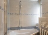 De keurige badkamer is voorzien van een ligbad met douche, wastafelmeubel en toilet.