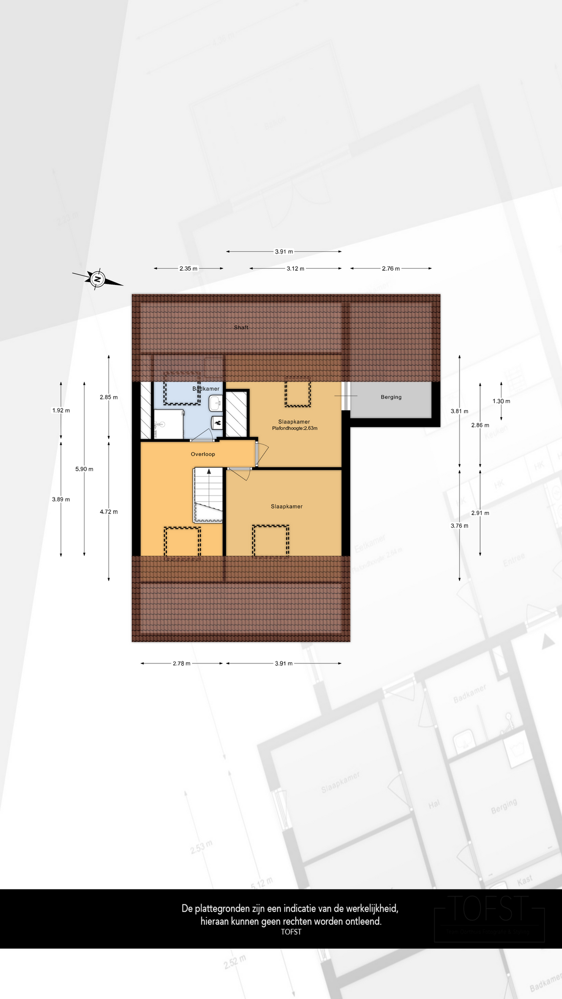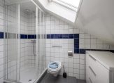 De tweede badkamer beschikt over een dakraam en is voorzien van een douchecabine, wastafelmeubel en een tweede toilet. In de badkamer bevindt zich ook de aansluiting voor de wasmachine en de opstelling van de CV ketel.