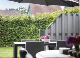 De prachtige, op zuiden gerichte tuin is zeer fraai aangelegd en beschikt over een ruim terras. Het royale perceel biedt volop privacy en rust. Daarnaast beschikt de woning over een eigen parkeerplaats en een vrijstaande houten berging (ca. 7 m²) voor opslag van tuingereedschap en fietsen.