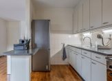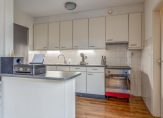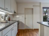 In de keuken staat een lichte wandopstelling met hoge bovenkasten, onderkasten en lades en een vaste hoge tafel aan de woonkamerkant. De apparatuur is los geplaatst, wat de kans biedt om eigen apparatuur te plaatsen of te kiezen voor een geheel nieuwe keuken met inbouwapparatuur.